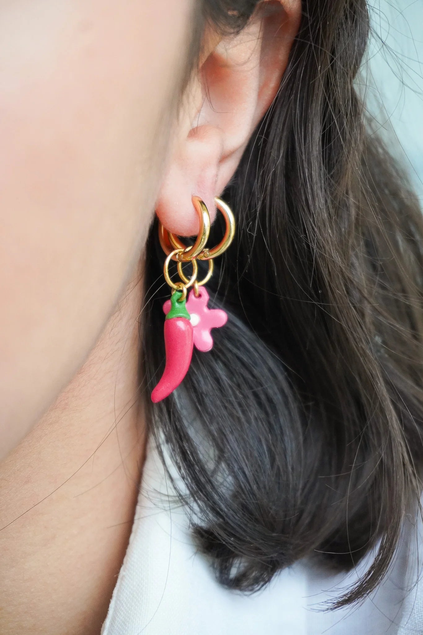 Nos créoles sont disponibles dans plusieurs formes pour sublimer votre visage, qu'elles soient discrètes ou épaisses. Nos créations artisanales, toutes dotées de charms en pâte polymère faits main, offrent un caractère unique à chaque pièce.