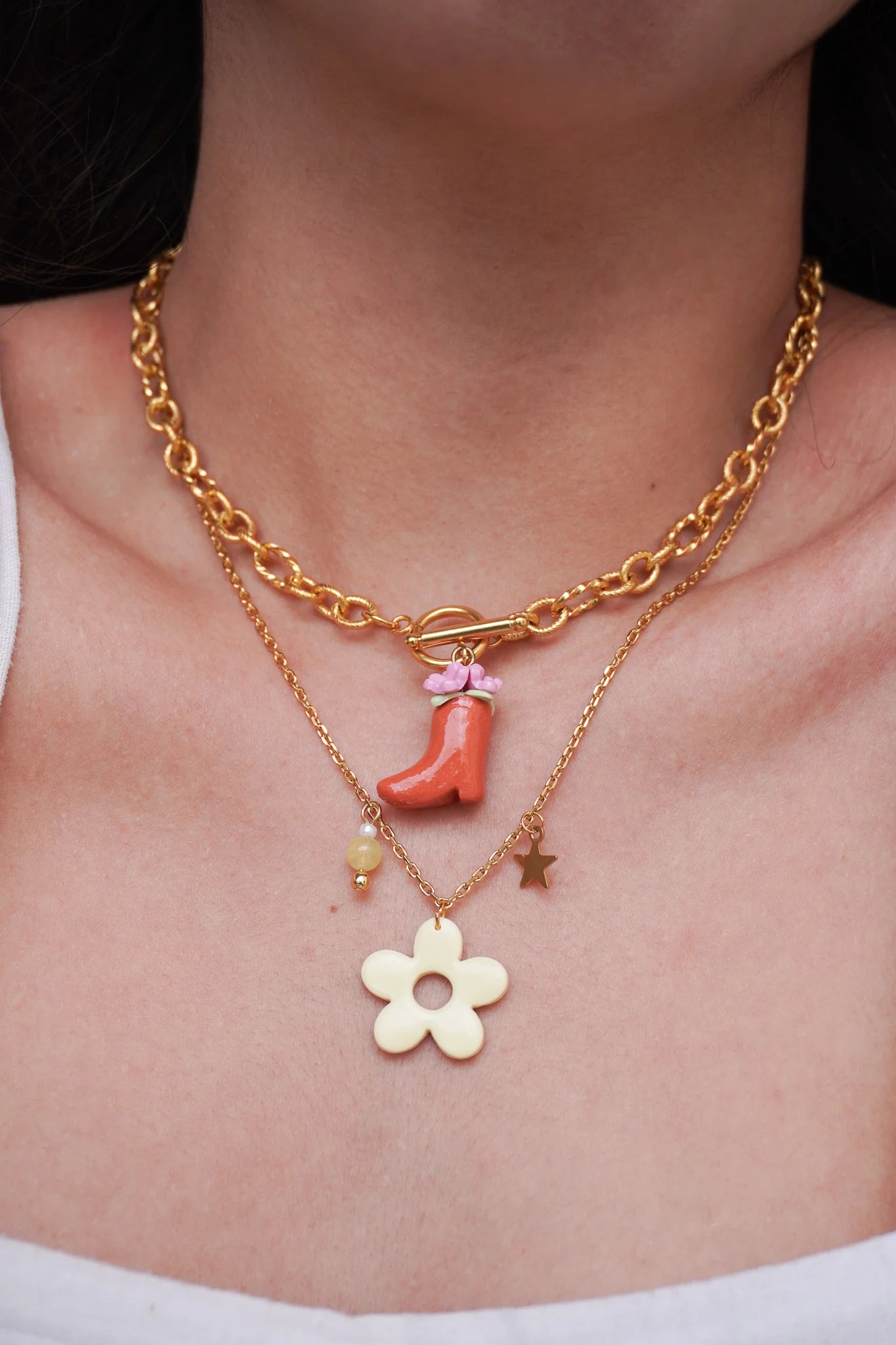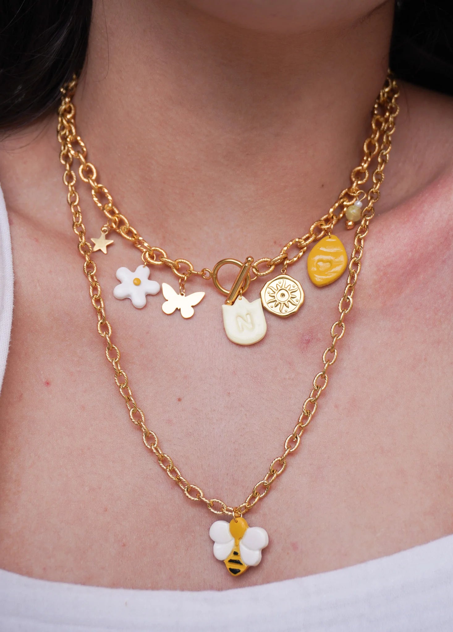 Notre collier est fabriqué avec des matériaux de premier choix tels que l'acier inoxydable et doré, assurant non seulement une beauté durable mais aussi une résistance à l'usure quotidienne. Vous pouvez personnaliser votre collier avec les perles où des charms en pâte polymère.